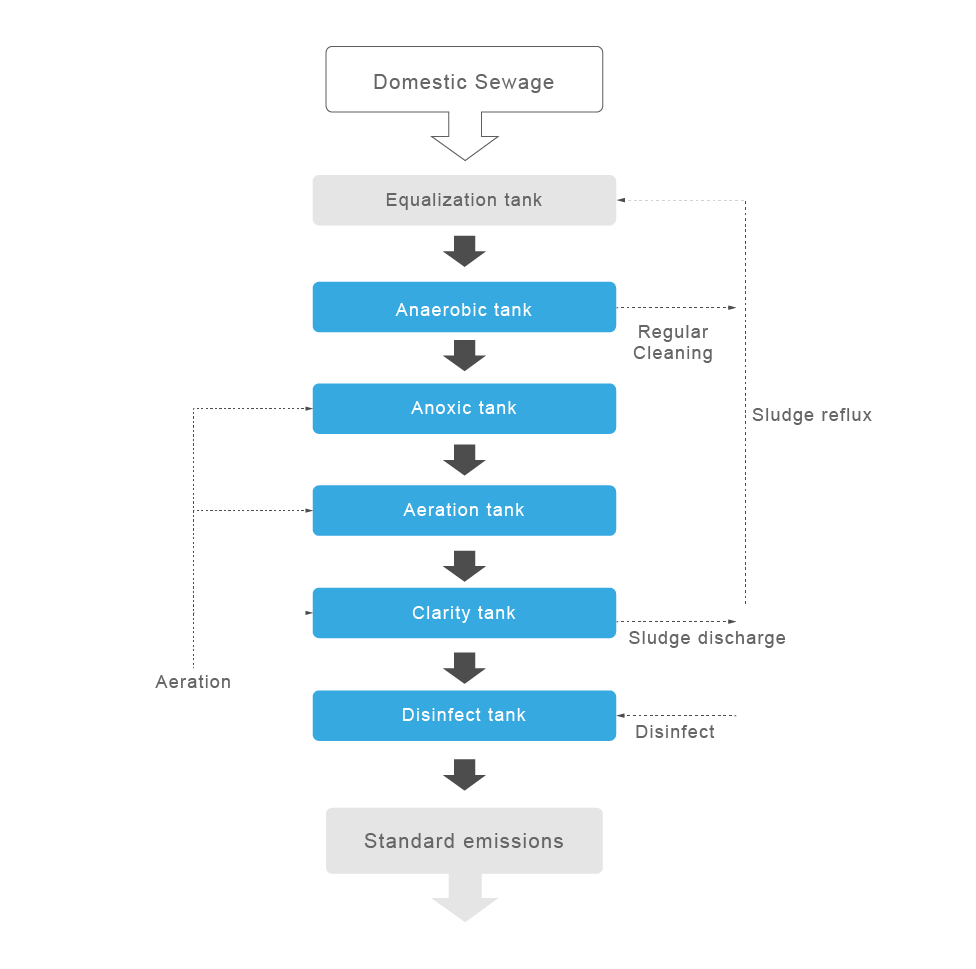 Diseñado para el tratamiento descentralizado de aguas residuales industriales o comunales, este sistema de tanque horizontal procesa decenas de toneladas de efluentes diariamente mediante un flujo continuo y cerrado. Las aguas residuales ingresan primero a una zona primaria para sedimentación y digestión anaeróbica, y luego pasan por un reactor biológico aeróbico extendido donde microorganismos descomponen la materia orgánica y los nutrientes. Tras la clarificación secundaria dentro del tanque, el agua tratada se somete a una desinfección final, cumpliendo siempre con los estándares de vertido o reutilización. El diseño horizontal, totalmente automatizado y eficiente en espacio, garantiza un funcionamiento fiable y de gran capacidad con un mínimo espacio y mantenimiento.